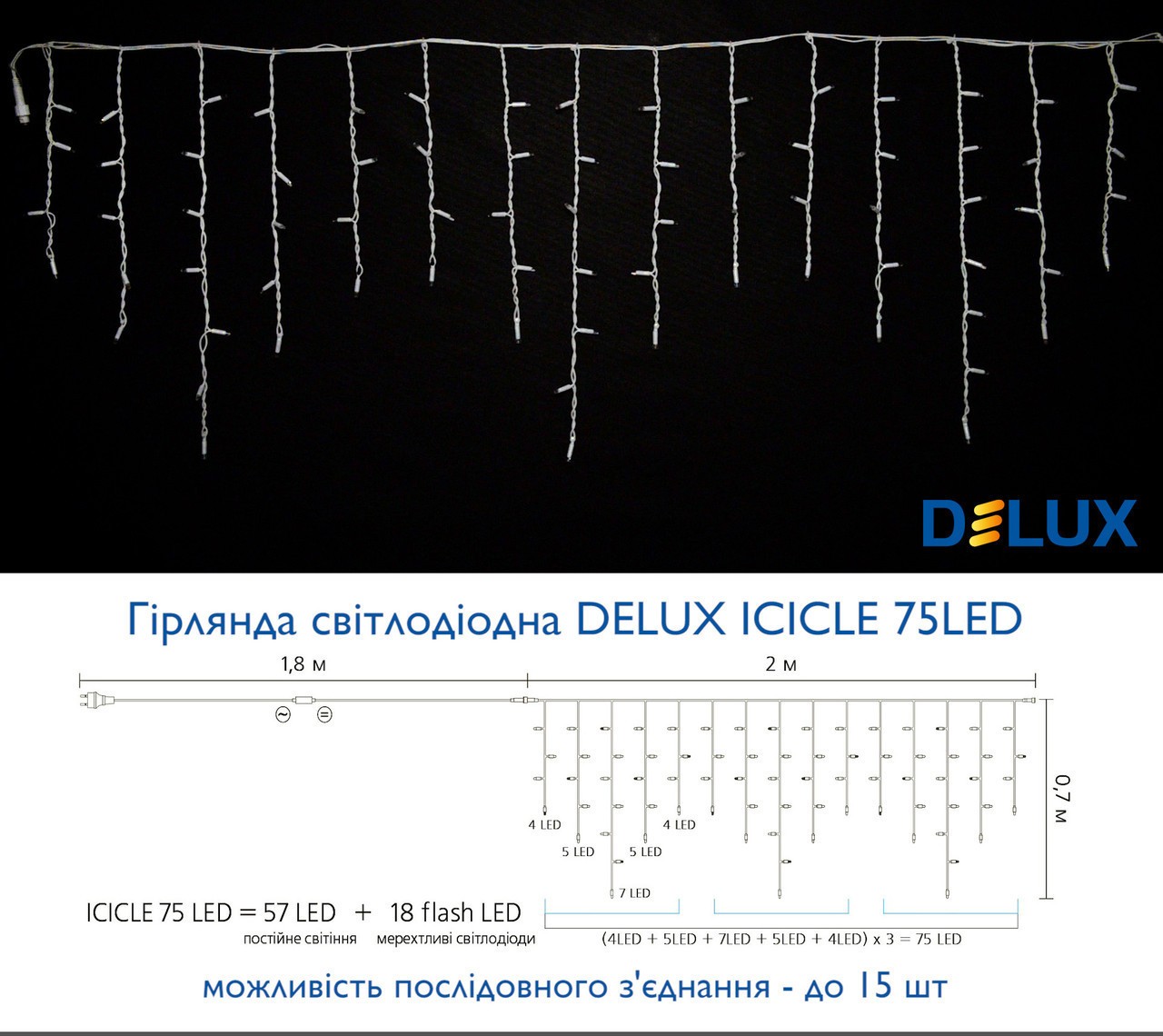 Гірлянда зовнішня DELUX ICICLE 75LED 2x0.7m 18 flash синій/білий IP44 EN