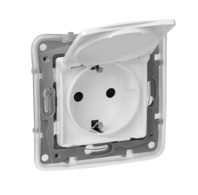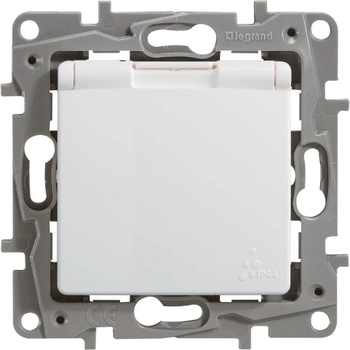 Розетка із заземленням LEGRAND Etika з кришкою та захисними шторками 2К+З ІР44 біла