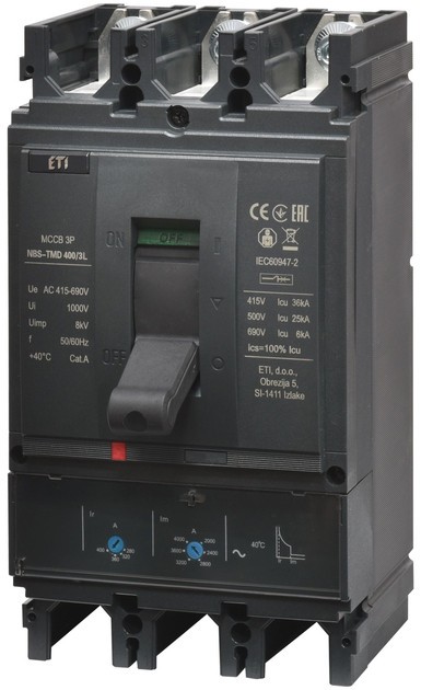 Автоматичний вимикач ETI NBS-TMD 400/3L 315A (36кА, (0.7-1)In/(5-10)In) 3P - це триполюсний автоматичний вимикач, призначений для захисту електричних ланцюгів від перевантажень і коротких замикань.