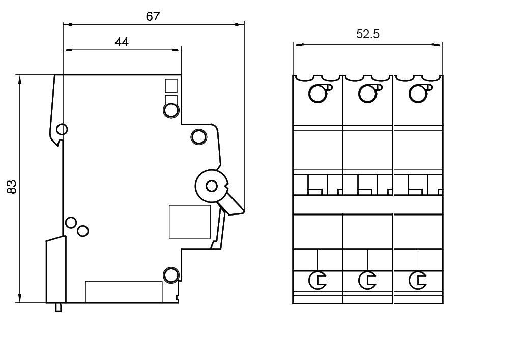 - Клеммник сверху или снизу, жесткие медные кабели 1...25 мм² макс.