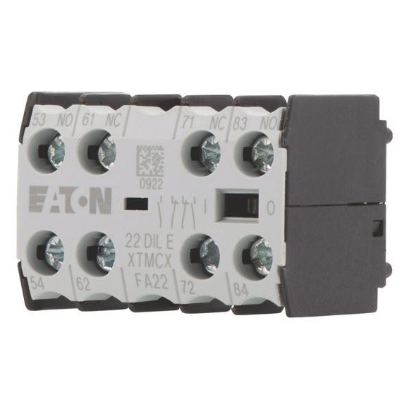 Блок додаткових контактів 22 DILE EATON має 4 полюси: 2 нормально відкриті (NO) та 2 нормально закриті (NC) контакти. Він встановлюється на передню поверхню контактора DILE та фіксується за допомогою гвинтів.