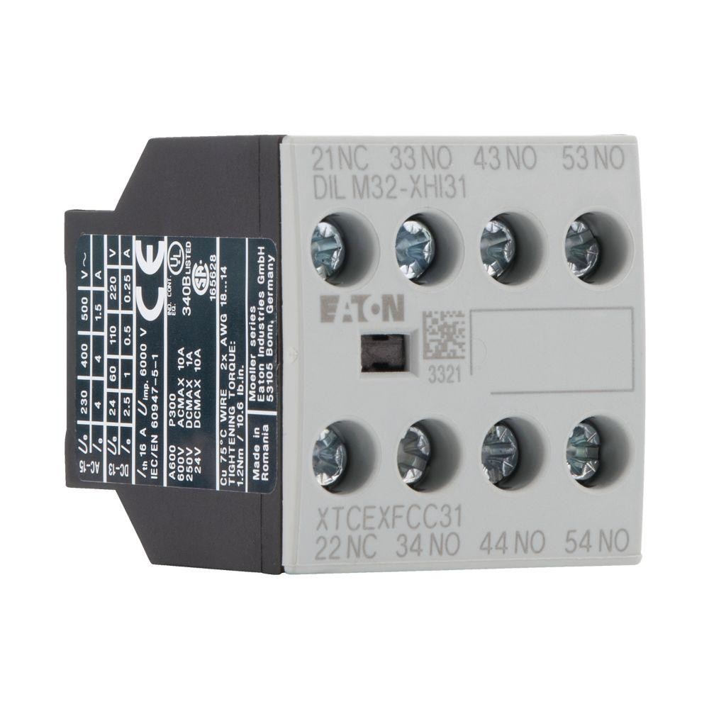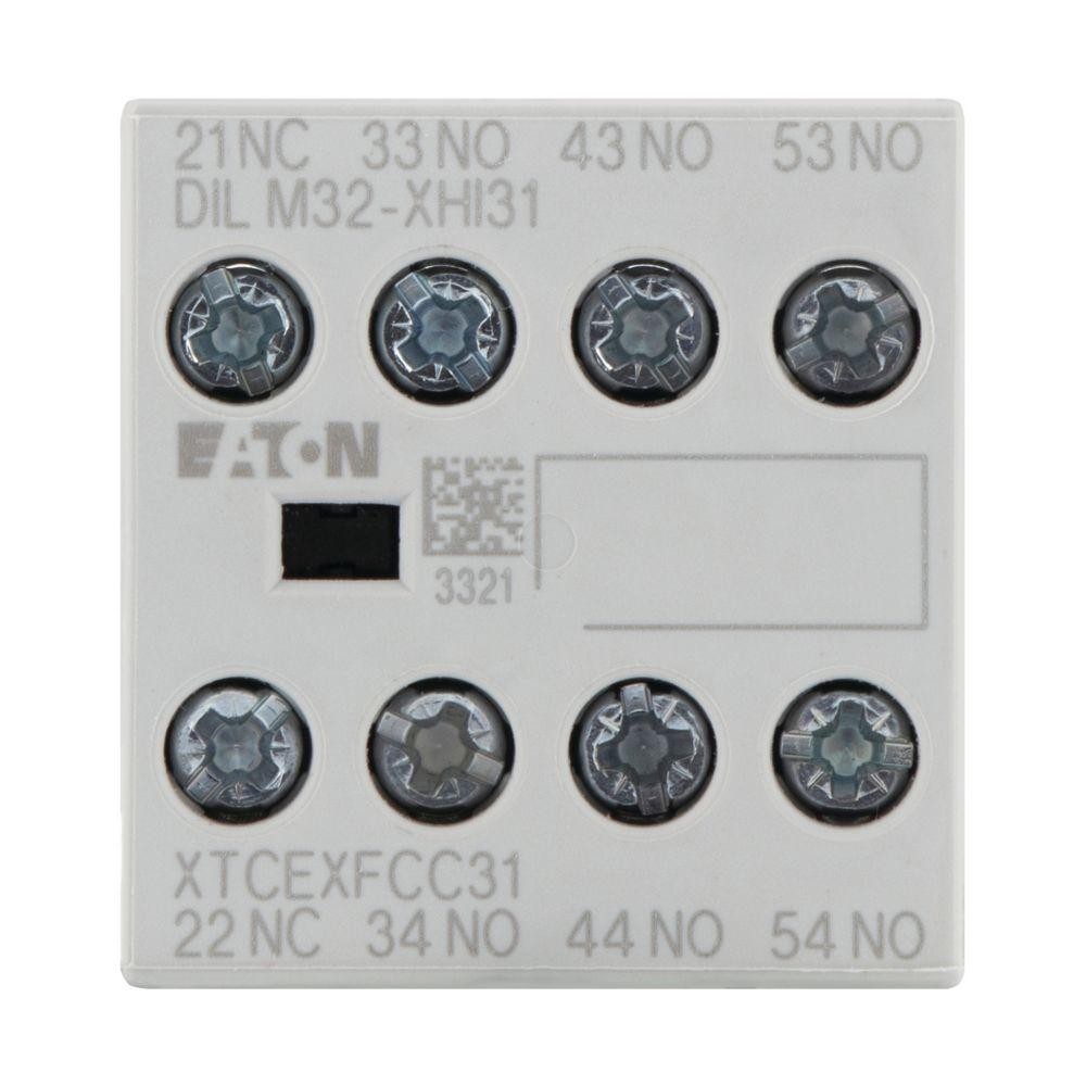 Блок додаткових контактів DILM32-XHI31 EATON призначений для використання з контакторами EATON серії DILM. Він має модульну конструкцію та легко встановлюється на контактор без використання спеціальних інструментів. Блок DILM32-XHI31 містить три нормально відкритих (NO) та один нормально закритий (NC) контакти.