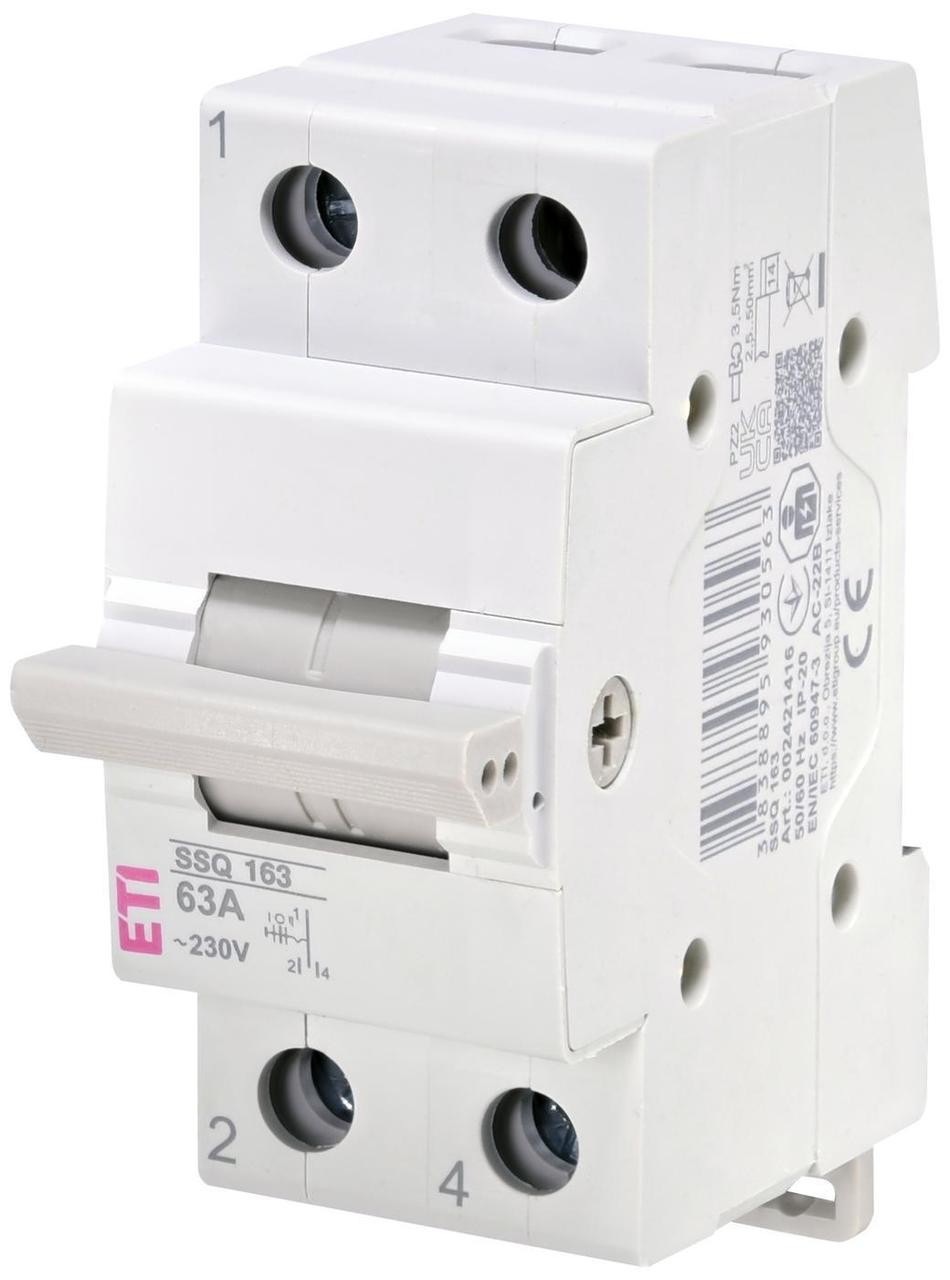 Перемикач навантаження SSQ 163 "1-0-2" від компанії ETI є однополюсним (1p) комутаційним апаратом, призначеним для ручного перемикання електричних кіл під навантаженням.