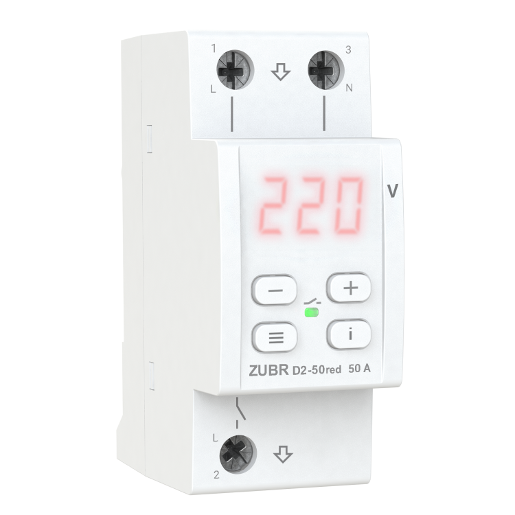 Реле напряжения ZUBR D2-50 red 1ф 50А 2мод вольтметр мін. напр. макс. напр. термозащита